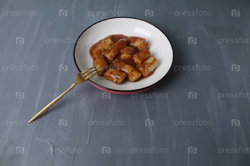 Сосиски из мяса в томатном соусе, кетчуп на тарелке, рядом вилка для еды с пространством для textk copyspace