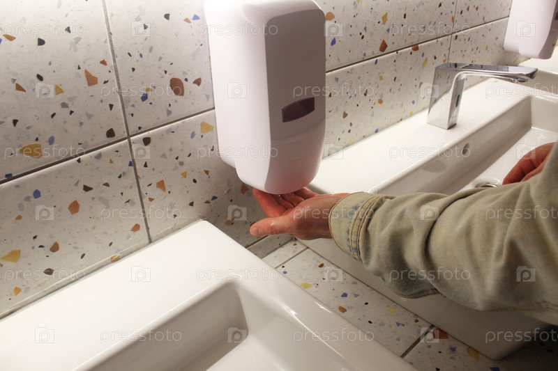 Человек, подбирающий мыло из диспенсера Близко