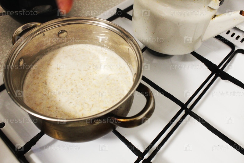 Молоко разогревают на газовой плите.Приготовление завтрака