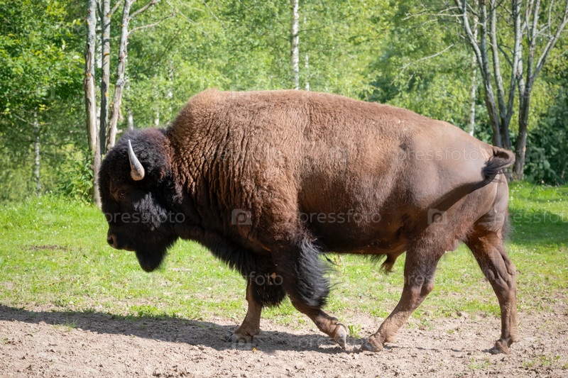 Европейский бизон ходит по траве в дикой природе