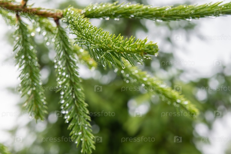 Капли воды на иголках ветвей елей