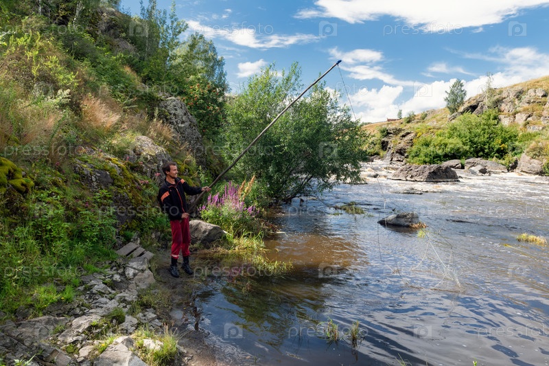 Каменск-Уральский, Свердловская область, Россия - 13 августа 2024 года: Мужчина ловит рыбу в горной реке