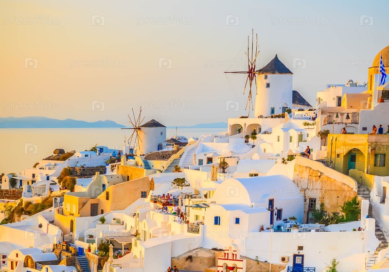 Закат солнца над деревенскими домами Оиа, остров Санторини, Греция
