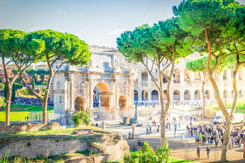 Арка Константина и Колизей в летний день, древний город Рим, Италия