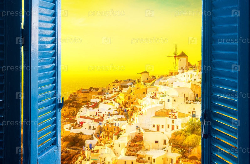 Знаменитый мягкий оранжевый закат города Оия с ветряной мельницей, остров Санторини, тонизированный