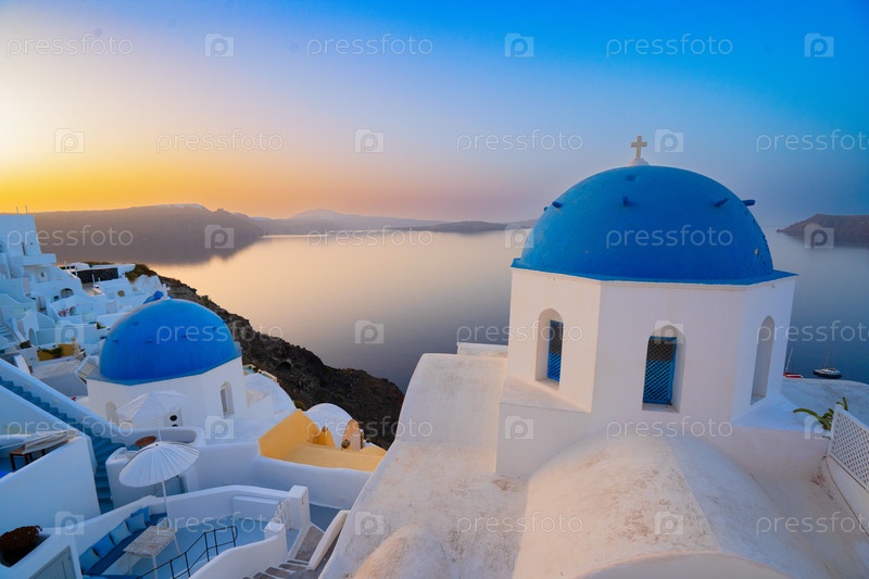 Традиционная греческая деревня Оя на Санторини, с голубыми куполами церквей и деревенскими крышами в мягком утреннем свете, Греция