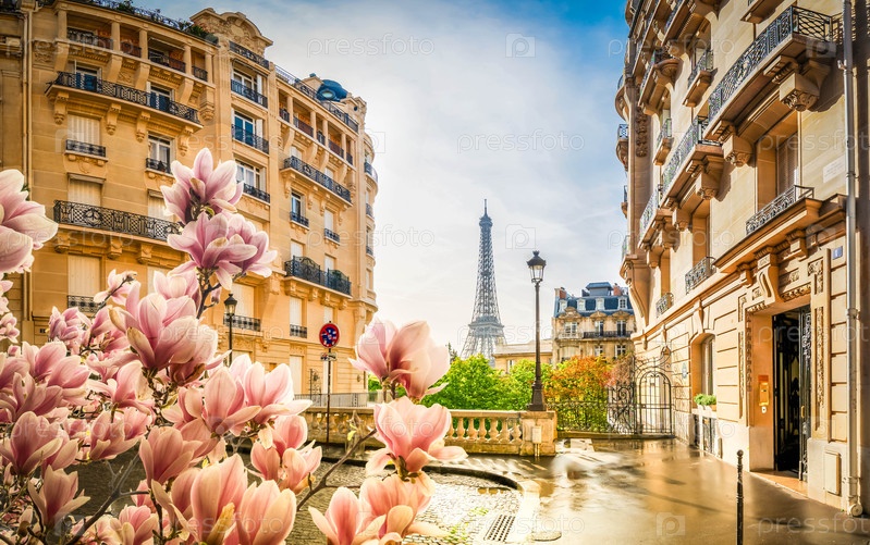 Уютная парижская улица с видом на знаменитую Эйфелеву башню в пасмурный летний день, Париж Франция