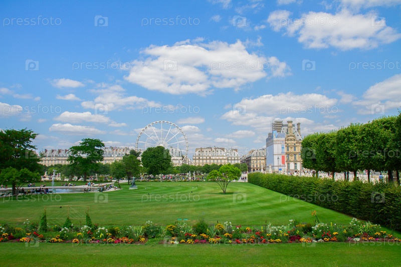 Сад Туилри в летний день, зеленая лужайка и голубое небо с облаками, Париж Франция
