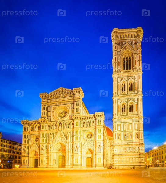 Соборная церковь Santa Maria del Fiore с колокольником ночью, Флоренция, Италия