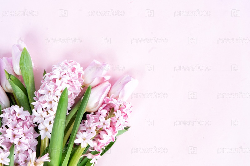 Пасхальная сцена со свежими тюльпанами и цветами гиацинта на розовом фоне, копировальное пространство