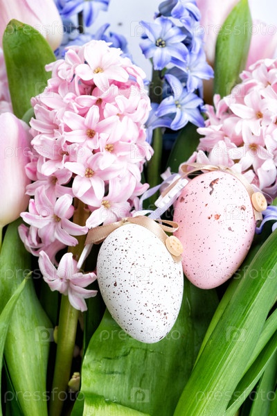 Пасхальная сцена со свежими цветами гиацинта и пасхальными яйцами