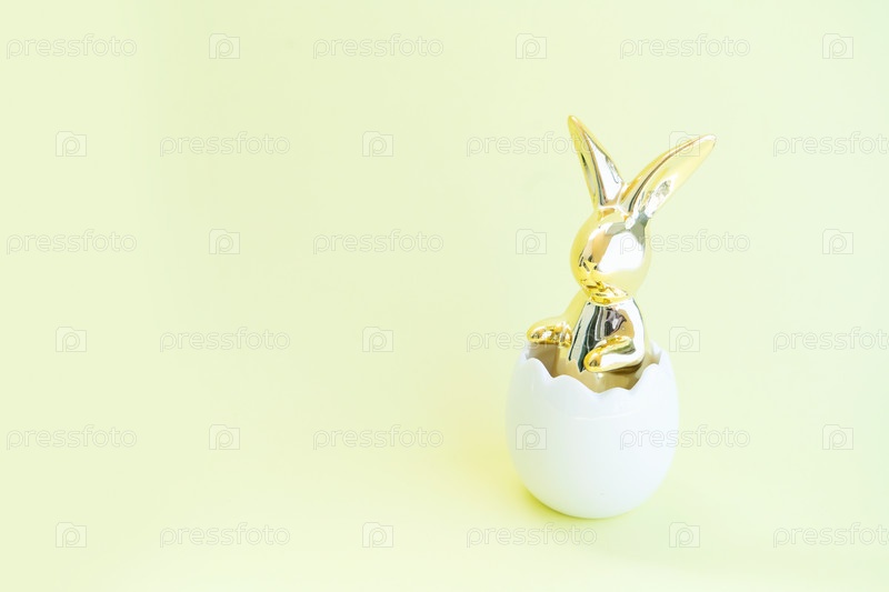 Охота на пасхальные яйца с пасхальным кроликом в орелке на желтом фоне