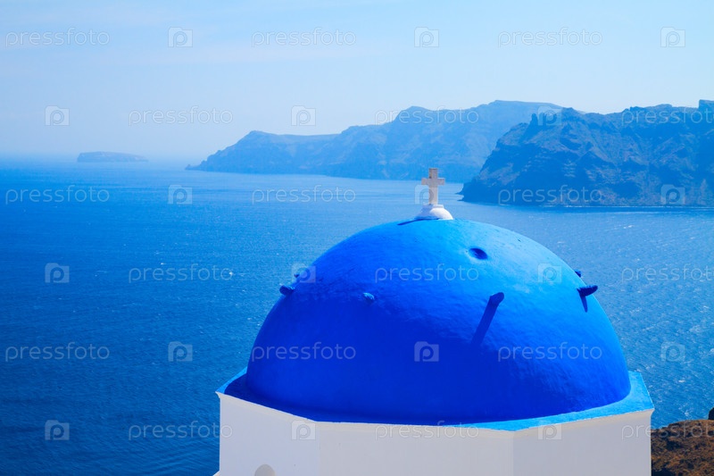 Традиционный синий купол церкви и голубая морская вода в летний день, Оиа, остров Санторини, Греция