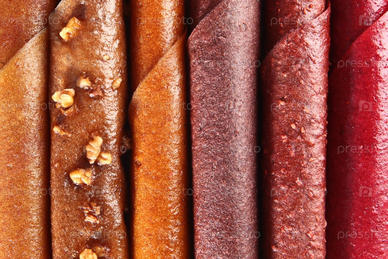 Таблетки в ассортименте. Вид фруктовой пасты. Фруктовая кожа на ломты (пастила). Естественный продукт. Фотографии для статей о здоровом питании. Красочные рулоны из плодовой кожицы как фон. Веганские сладости