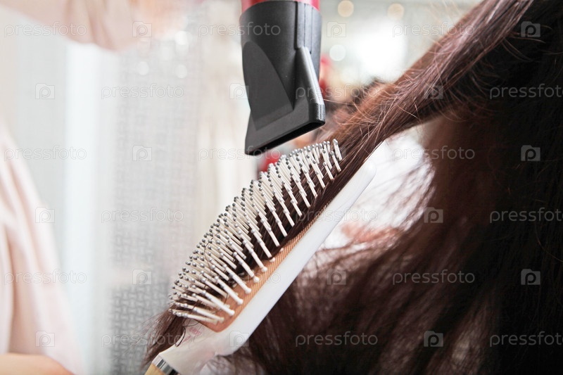 Женщина сушит волосы в салоне красоты с помощью фейерверка. гребень и фейерверк на близком расстоянии. Концепция салонов красоты. Сушка длинных коричневых волос с помощью фейерверка и плоской кисти