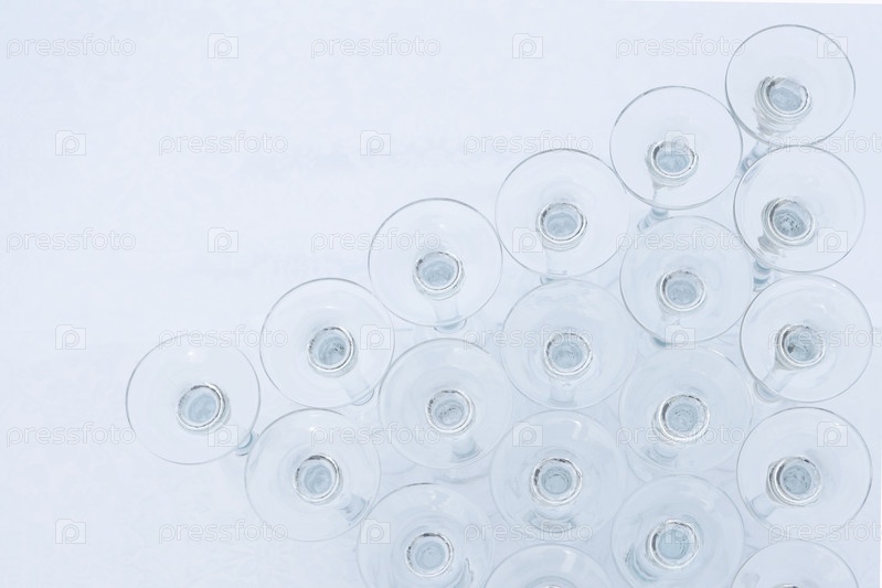 Подготовка к буфету. Винные стаканы перевернуты вверх дном. Чистые бокала для воды или вина. Белый фон. Вид сверху