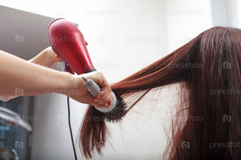 Женщина стилизует волосы с помощью фризеры в салоне красоты. Сушка длинных коричневых волос с помощью фризера и круглой кисти. Концепция салонов красоты. гребень и фризер ближайший снимок