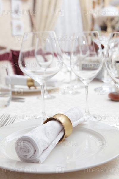 Установка праздничного стола. На тарелку помещается белая салфетка с желтым металлическим кольцом. Пустые бокалы для напитков. Концепция праздничных мероприятий. Подготовка к приему гостей