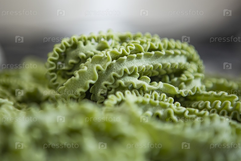 Домашняя паста из твердой пшеницы. Грубая поверхность свежей пасты. Индикатор высокого качества. Паста зеленая. Естественные красители. Концепция итальянской кухни. Здоровое питание