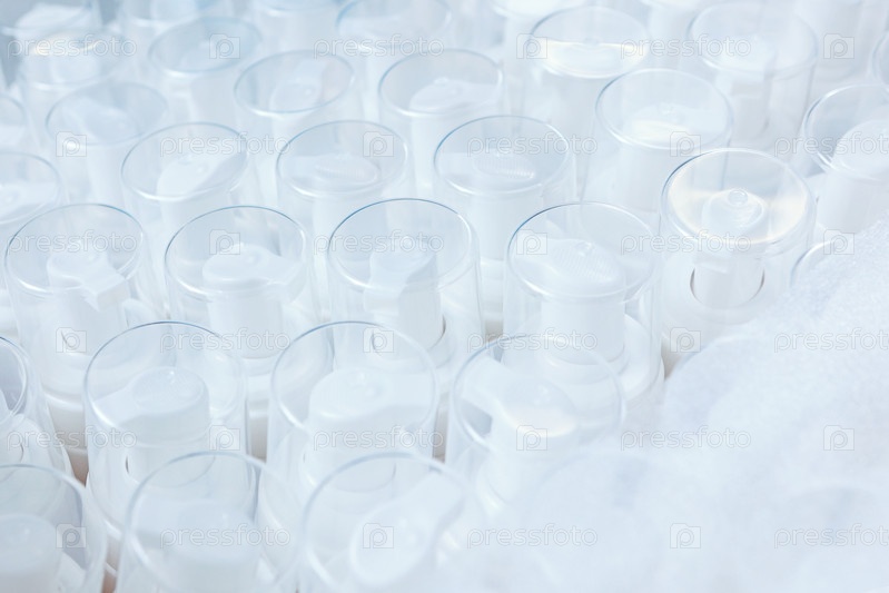 Большое количество белых пластиковых бутылок для косметики без ярлыков. Производство косметики. Вид сверху. Выборочная фокусировка