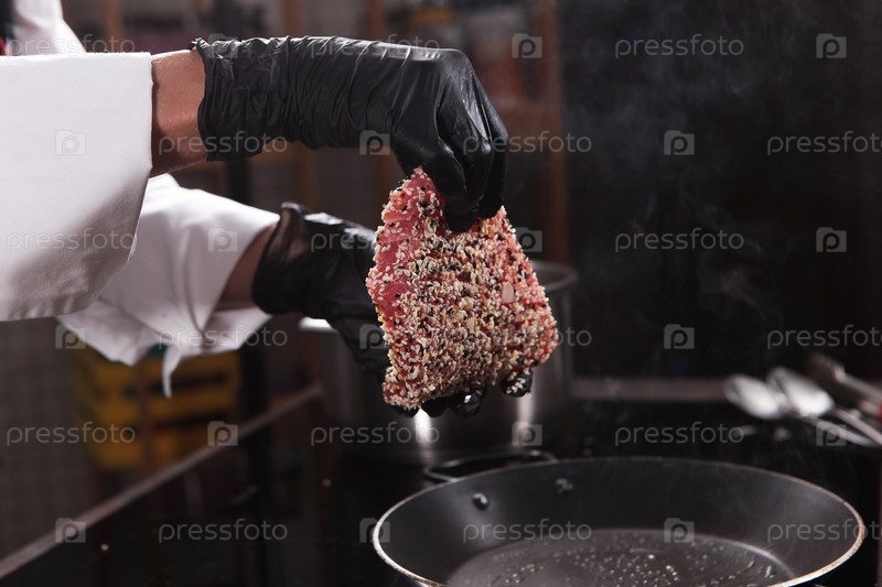 Шеф-повар готовит стейк из тунца белое и черное кунжутное семя здоровое блюдо с низким содержанием калорий фотографии на кухне сковородка Близкий снимок