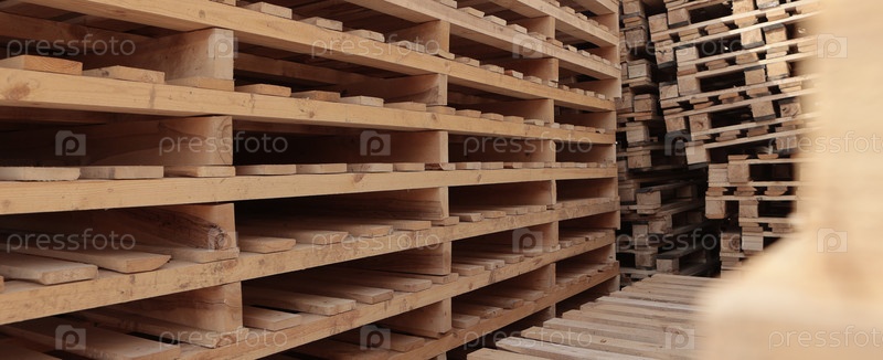 Столки деревянных поддонов для перевозки тяжелых грузов. Хранилище древесины на открытом воздухе. Деревянные поддоны. Узкий баннер