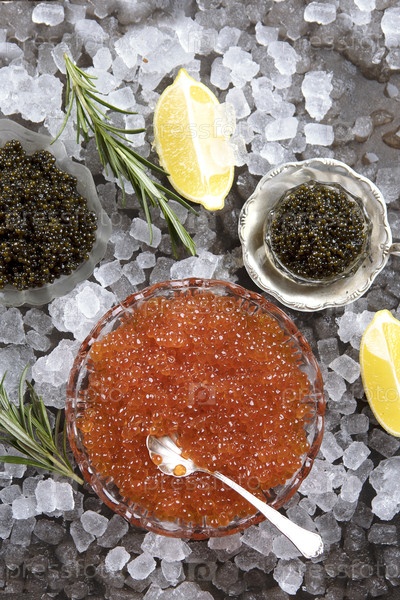 Красная и черная икра подается с льдом. натуральные омега и деликатес для праздничного стола. лимонные ломтики рядом с иконой. вид сверху