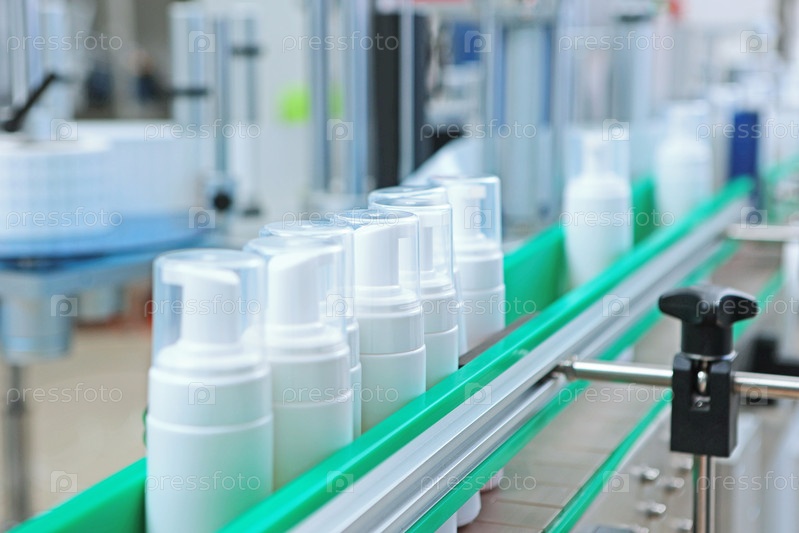 Белые пластиковые бутылки с диспенсерами и прозрачными крышками перемещаются вдоль конвейера. Производство косметики и средств по уходу за кожей. Машина для закрывания и маркировки
