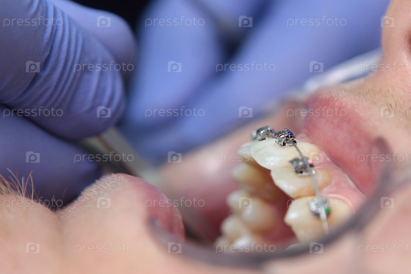 Брекеты на передних зубах в ближайшем плане. Установка брекетов. Коррекция малокклюзии или зубчатости. Пинцет в руках ортодонта. Макрофотография