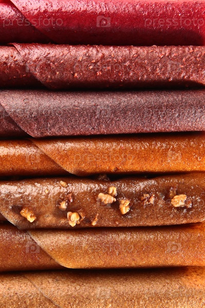 Таблетки в ассортименте. Некий вид фруктовой пасты. Фруктовая кожа на кусочках (пастила). Естественный продукт. Веганские сладости. Фотографии для статей о здоровом питании. Красочные рулоны из плодовой коры как фон