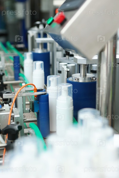 Белая пластиковая бутылка движется вдоль конвейера.Производство косметики.Машина для закрывания и маркировки