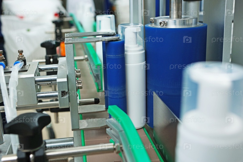 Конвейерная лента с пластиковыми бутылками для производства косметики. Белые пластиковые бутылки перемещаются по конвейеру. Бутылки без этикеток. Машина наклеивания и маркировки