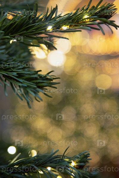 Рождественские огни и еловые ветви. Рождественская текстура для открыток. Гирлянды с огнями на елке. Место для рекламы. Концепция рождественских украшений на улице