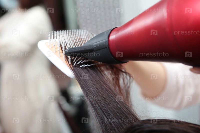 Женщина сушит волосы в салоне красоты с помощью фризуры. гребень и фризура на близком расстоянии. Сушка длинных коричневых волос с помощью фризуры и плоской кисти. Концепция салона красоты