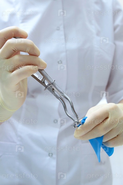 Изоляция одного или нескольких зубов перед процедурой.Защитная коробка находится в руках стоматолога.Стоматолог держит латексную эластичную пластину в своих руках.Охрана мягких тканей полости рта от контакта с инструментами