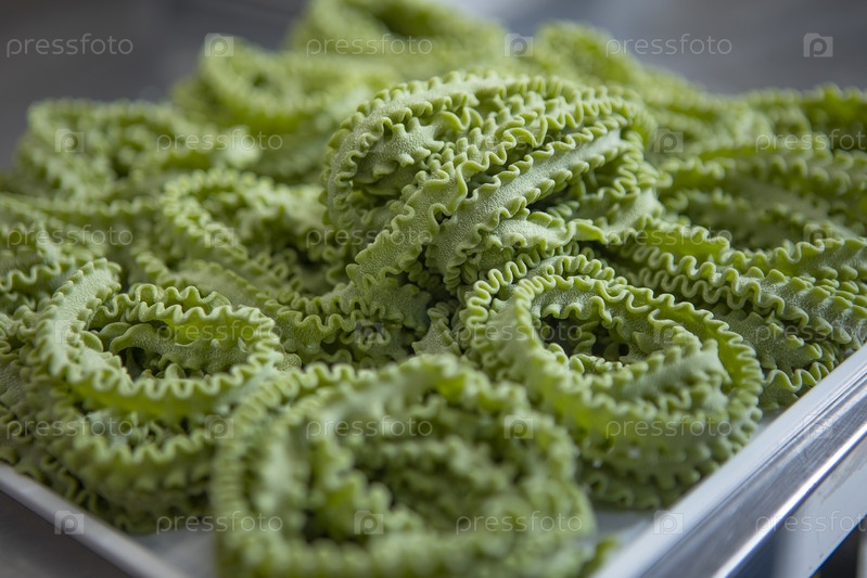 Свежая паста. Паста зеленая, окрашена в натуральные красители. Макароны из муки твердой пшеницы. Здоровая пища. Грубая поверхность свежей пасты. Показатель высокого качества