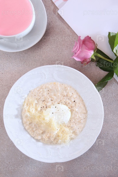 Овсяная каша на завтрак. Розовый чай мача. Цветок розы на столе. Здоровый завтрак. Страница меню. Меню кафе. Плоское питание. Вид сверху
