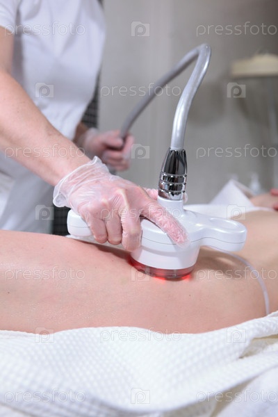Молодость и эластичность кожи. Борьба с целлюлитом. Красочные процедуры для тела. Массаж тела радиочастотным устройством. Женское тело проходит процедуру в клинике красоты