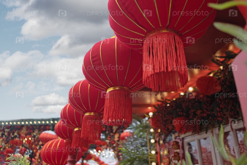 Новый год. традиционные красные китайские фонари на улице. пустынный. национальные украшения китайского нового года