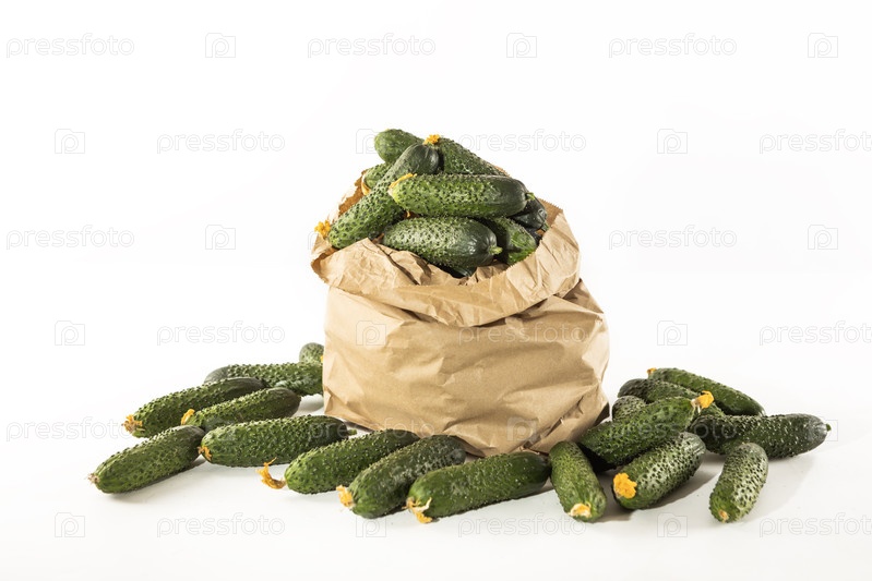 Ферма зеленых огурцов в бумажном пакете. свежие овощи для диетического питания. экологически чистые упаковки для овощей. низкокалорийная пища. здоровое питание. копирование пространства. изолированный объект