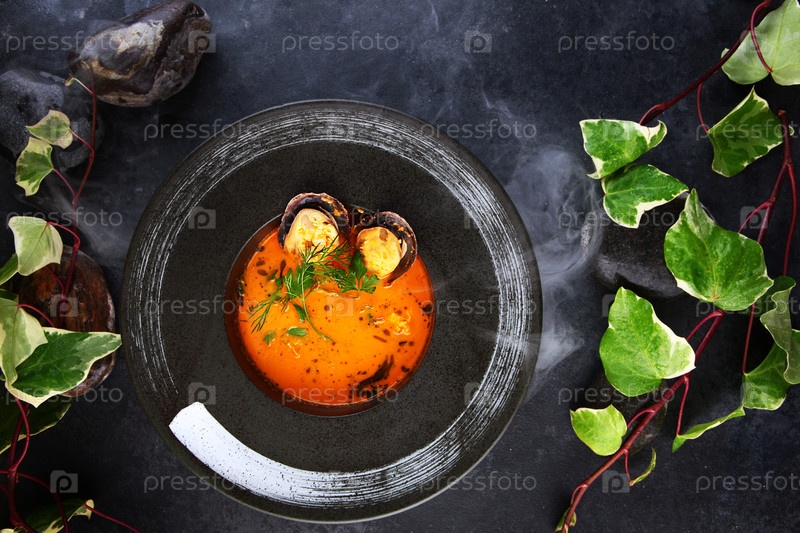 Том-ямский суп с пряностями и морепродуктами. национальное блюдо Лаоса и Таиланда. тайский кислый и острый суп. темный фон. фотографии для меню ресторана