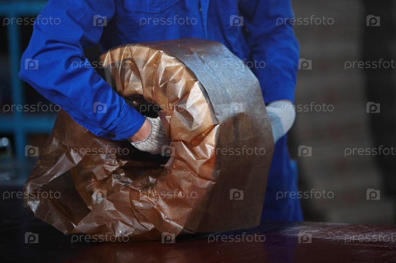 Рабочие упаковки готового подшипника. Масляная пергамент для упаковки металлических изделий. Готовые продукты на фабрике. Тяжелая промышленность. Семинар на заводе тяжелой промышленности