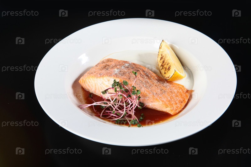Кусок лосося на белой тарелке, украшенный микрозелеными растениями и специями. Филе рыбьего сальмона с лимонным куском на гриле. Лимонный кусок на гриле. Вкусное блюдо из морепродуктов. Здоровая еда