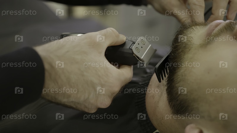 Профессиональный парикмахер подстригает бороду клиента с помощью триммера