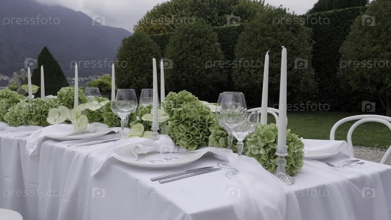 Элегантная столовая на открытом воздухе с красивой зеленью и мягким свечовым освещением
