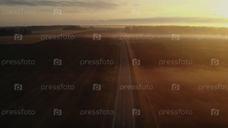 Вид с воздуха, летящий над дорогой во время туманного восхода солнца