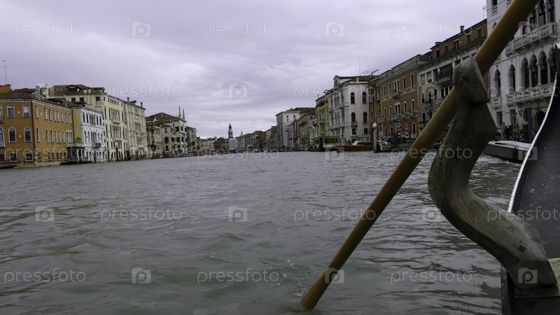 Гондольщик продвигает гондолу через воды грандиозного канала мимо красочных венецианских зданий