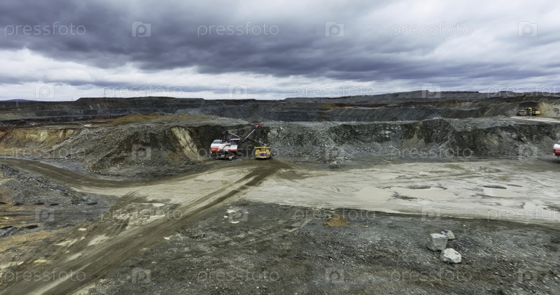 Шахтные грузовики работают в открытой шахте под облачным небом