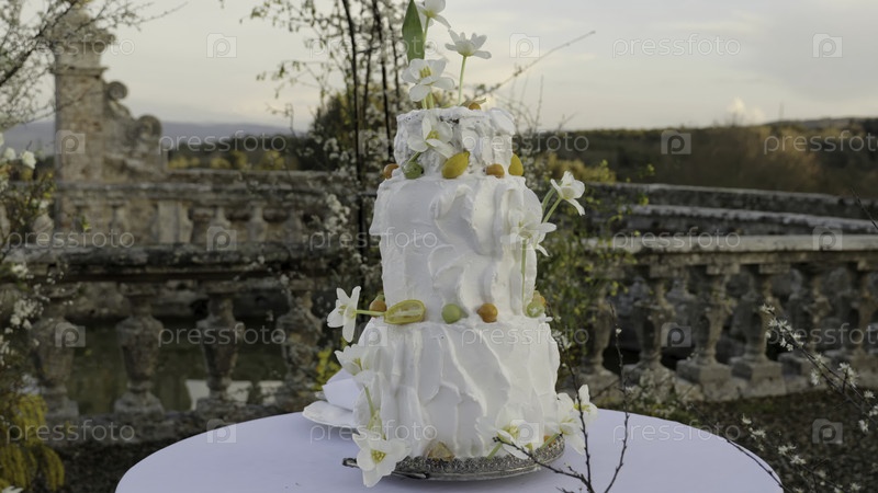 Элегантный белый свадебный торт выставлен на столе в саду