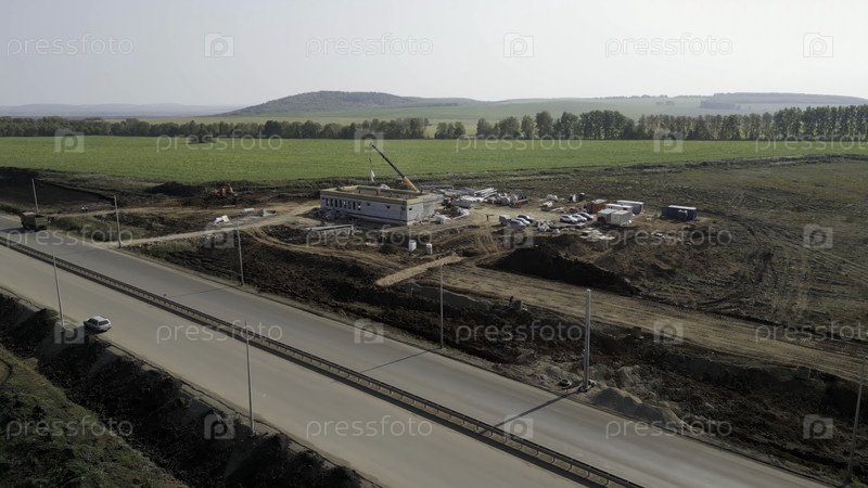 Строительная площадка прогрессирует вблизи шоссе с рабочим краном